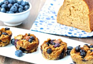 If you have a little extra time on your hands, my Blueberry French Toast Muffins are the perfect addition to your child’s lunchbox. They also make a great portable breakfast or after school snack. Made with whole grain bread, eggs, and blueberries, and lightly sweetened with maple syrup, these muffins will satisfy your kids’ hunger and provide them with the energy for learning and fun. I take all of the ingredients that you find in French toast and make a portable version by baking them in a muffin tin. And the best part is that you can make a whole batch of them on the weekend and you’re set for the whole week!