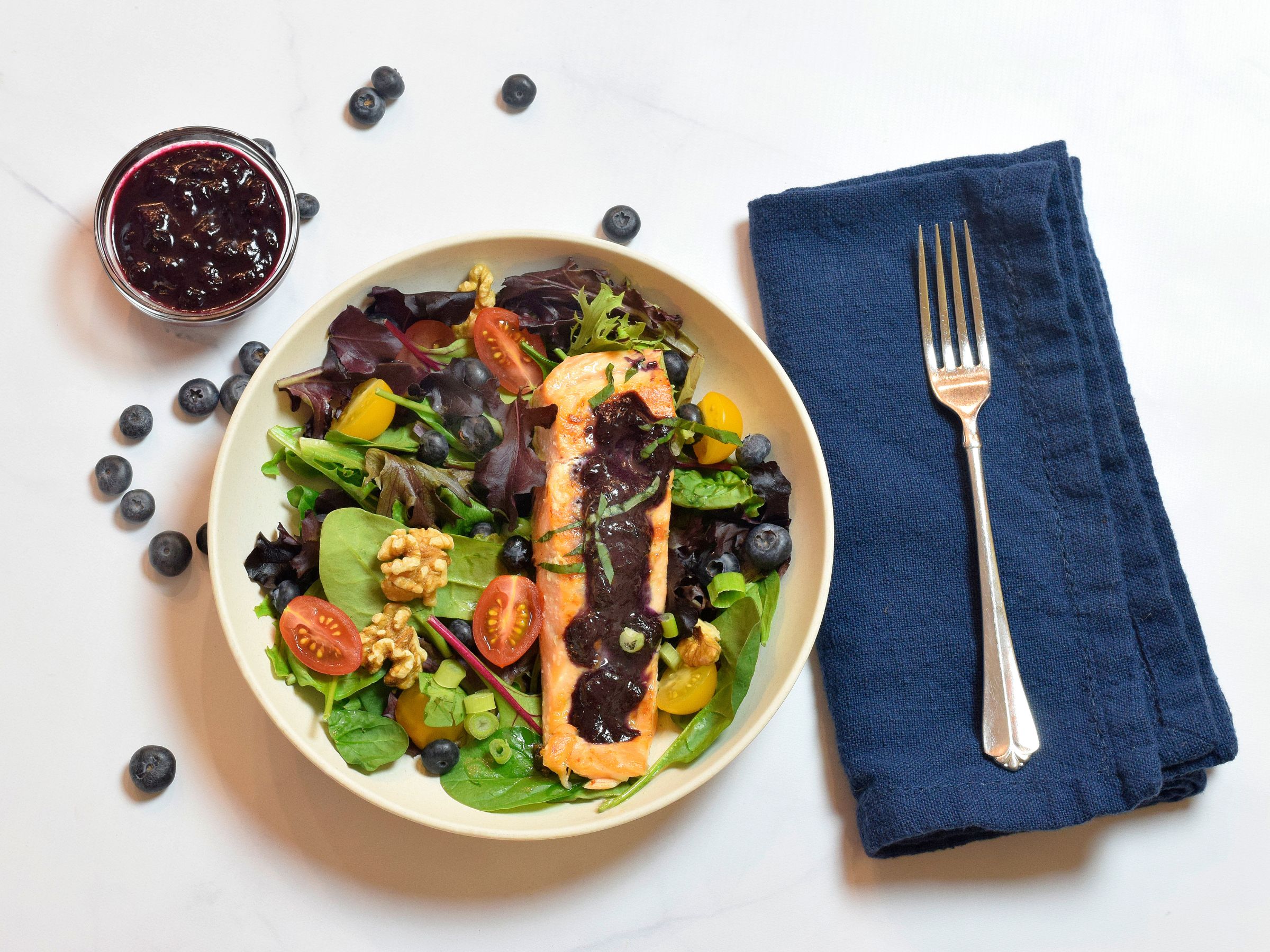 Additionally, research shows that the equivalent of a half cup of fresh blueberries per day, consumed as freeze-dried blueberry powder, can help middle-aged individuals against cognitive decline when implemented early in at-risk individuals. The potential mechanisms for these findings may be associated with anthocyanins and proanthocyanidins, the bioactive flavonoid compounds found in blueberries responsible for their vibrant blue color. The blueberries and basil scream summer, and you can cook the salmon on an outdoor grill, so this recipe is perfect for any summer gathering.