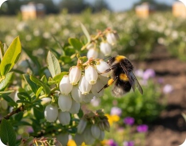 When warmer days arrive, bushes bloom with clusters of white flowers. Pollination begins, often helped by bees and other pollinators. Some growers even plant native flowers nearby or add beehives to boost yields