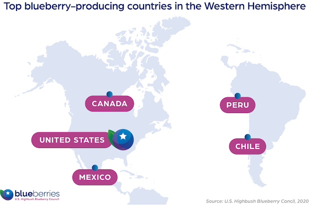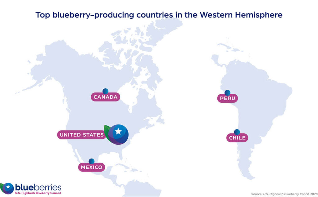 In Canada, British Columbia is the primary producing region for blueberries. South of the U.S., Peru is the largest producing country, followed by Mexico, Chile and others. These farmers play a crucial role in keeping fresh blueberries on grocery store shelves throughout the year, especially during our winter months.