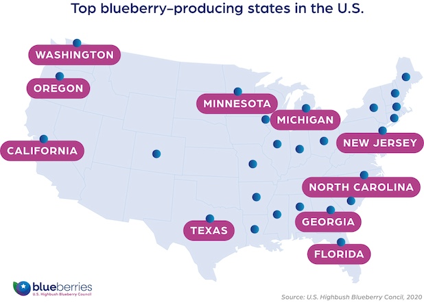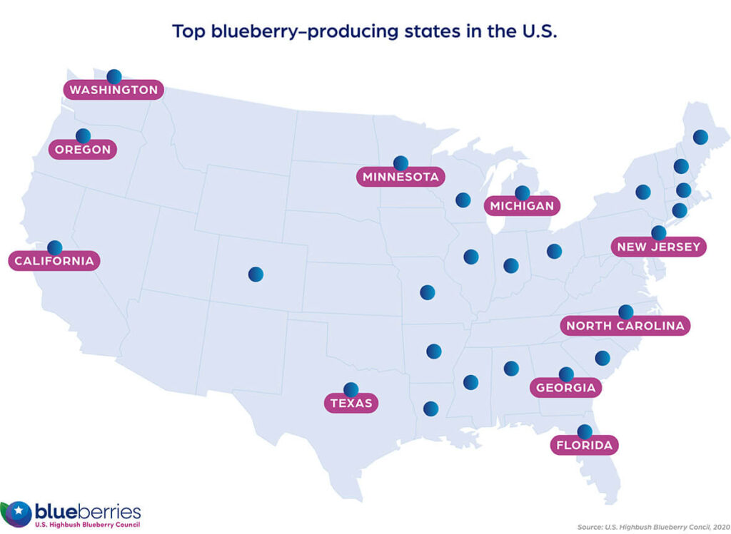 In the U.S., Highbush blueberries grow in at least 26 states across the country. However, most of the total domestic production comes from Washington, Oregon, California, Michigan, Georgia, North Carolina, New Jersey and Florida.