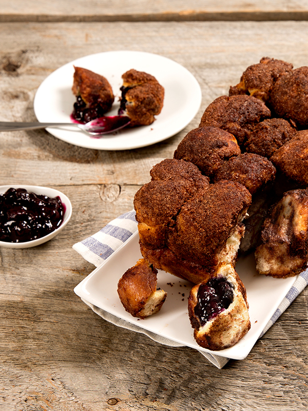 - Divide each piece of biscuit dough into thirds. Spoon 1 teaspoon chilled blueberry compote into the center of one dough piece. Carefully fold dough over top of the blueberry compote and firmly pinch the seams closed. If necessary, wet edges of dough with cold water to secure seams. Roll filled dough gently between your hands to smooth out the seams and form a ball. Repeat until all pieces of dough are filled. (You will have additional blueberry compote left to serve with baked pull apart bread.)