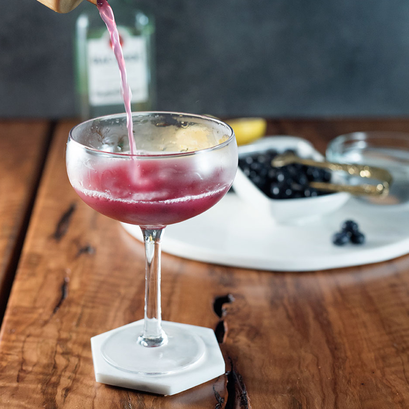 - In a shaker, muddle blueberries. Fill with ice and add rum, lemon juice, and 1 tablespoon simple syrup.