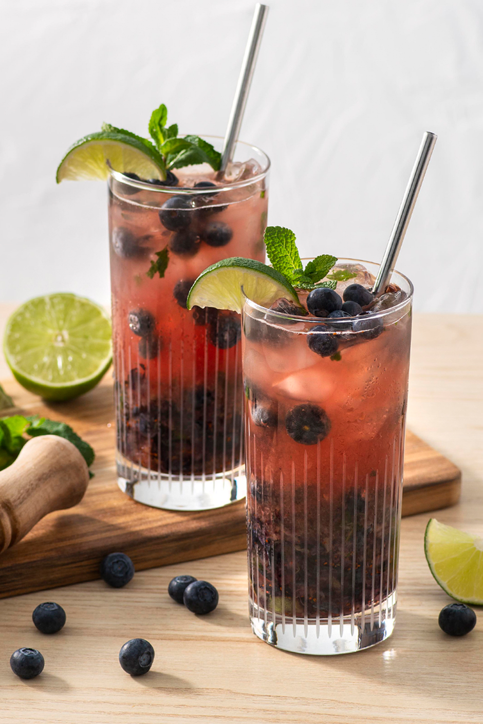 - In a tall 16-ounce glass, add mint leaves, 1 tablespoon of lime juice, and sugar. Mash the ingredients with the back of a spoon or a “muddler” until fragrant. Add 2 tablespoons of the blueberries and mash until juicy.