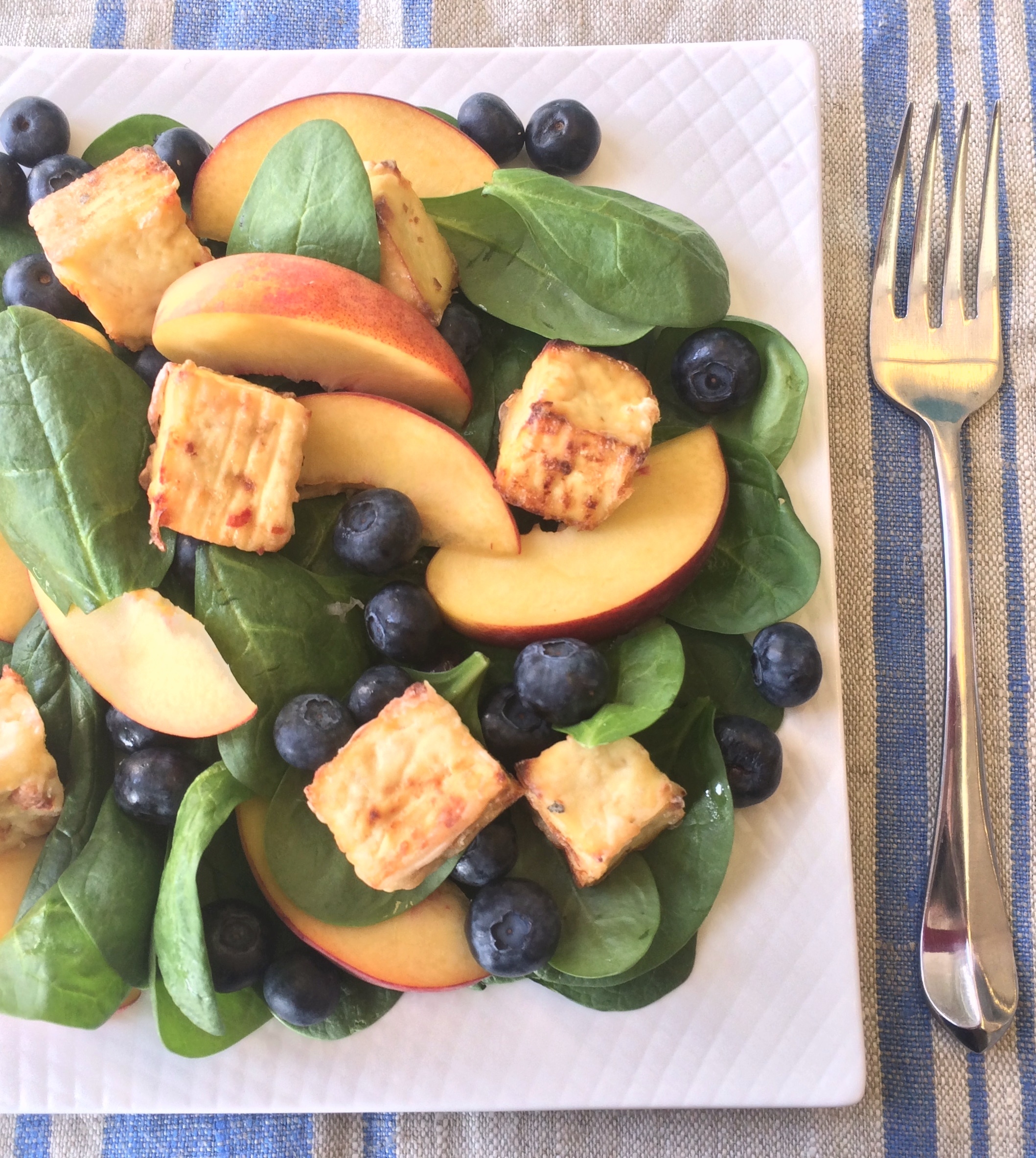 6. To serve, spread spinach on a platter. Top with tofu, peaches and blueberries. Drizzle with remaining salad dressing.