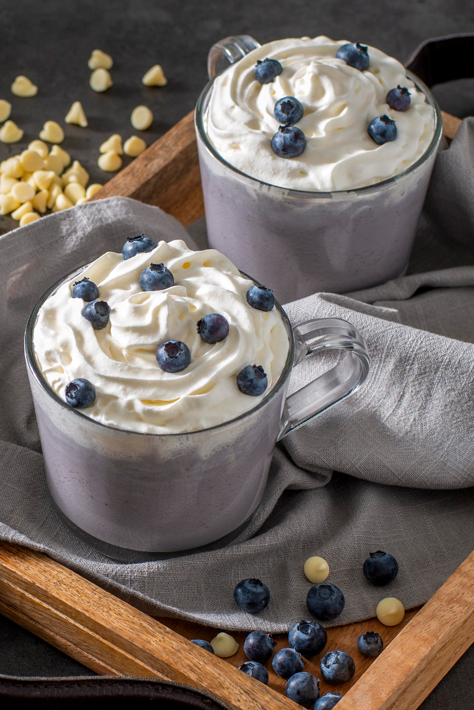 - Divide equally between 4 mugs. Garnish each mug with 2 tablespoons of whipped cream and 2 tablespoons fresh blueberries.