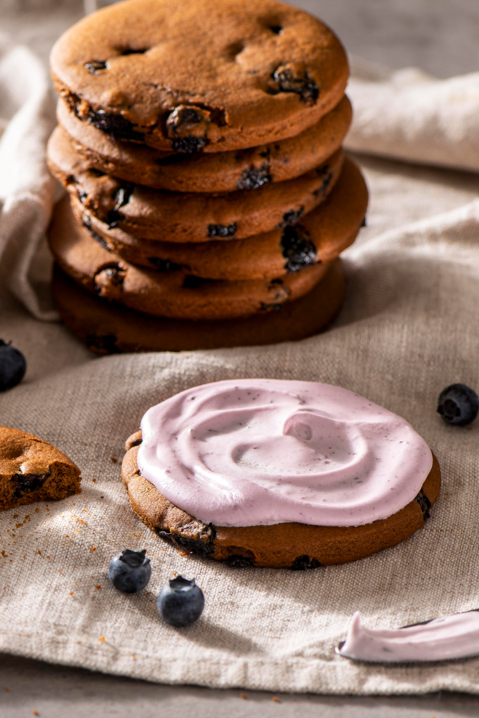 3. Increase speed to high; beat in puréed fresh blueberries and vanilla until smooth and spreadable (thicken with more icing sugar or thin with water if needed). Cover with plastic wrap until ready to use. Spread or pipe icing onto cookiesdecorate with dried blueberries.