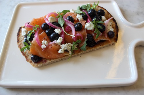 Smoked Salmon Flatbreads with Savory Blueberry Jam and Goat Cheese