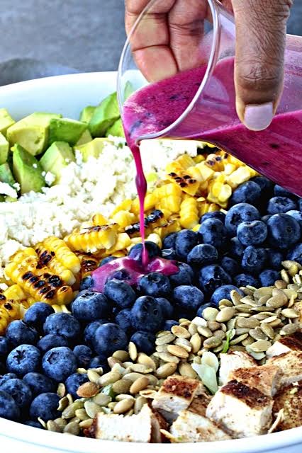 - Arrange the lettuce and spinach in a large serving bowl. Arrange the chicken, corn, avocado, blueberries, queso fresco, and pumpkin seeds in rows on top of the greens.