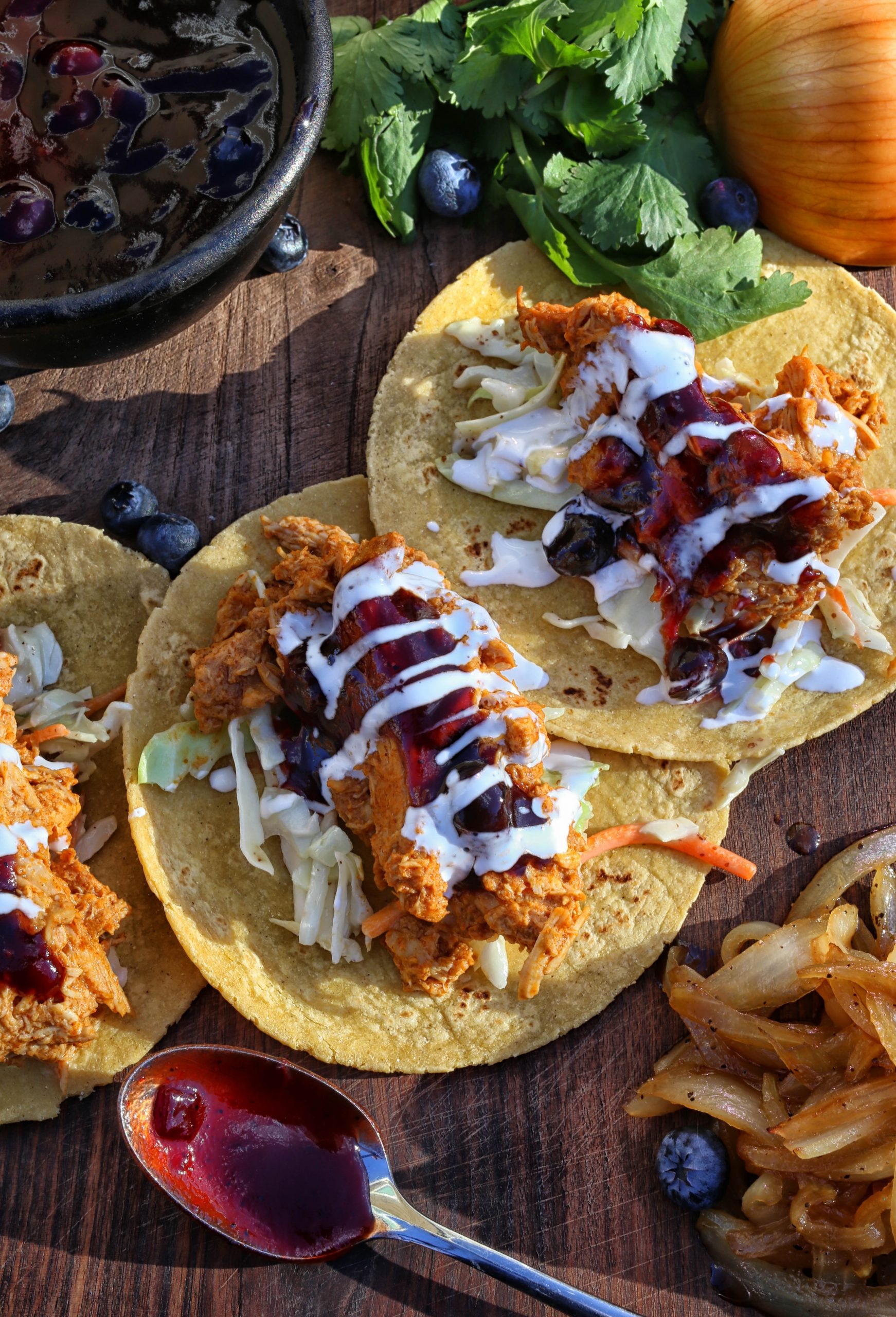 5. Drizzle Mexican crema and remaining blueberry BBQ sauce. Garnish with cilantro or shaved scallions, if desired.