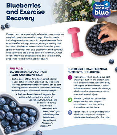 We’ve created one 8.5×11” print-ready tip sheet geared toward health professionals, available for download below. Suitable for in-person handouts, online content or message inspiration, the tip sheet delivers enticing and informative facts about blueberries and exercise recovery, along with a timely sampling of recipes from blueberry.org.