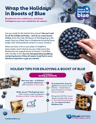 We’ve created one 8.5×11” print-ready tip sheet geared toward consumers, available for download below. Suitable for in-person handouts, online content or message inspiration, the tip sheet delivers enticing holiday inspiration around blueberries – from how to get involved during the season of giving to a timely sampling of recipes from blueberry.org.