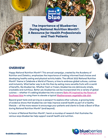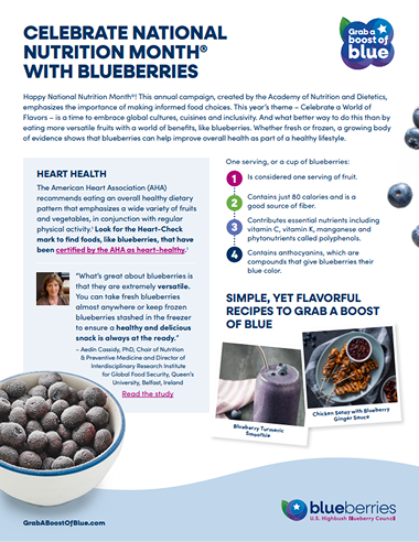 Encourage your customers, partners and community to learn more about the benefits of blueberries and how they can help support overall health and nutrition. Simply click the image below to download this resource for digital or printed use.